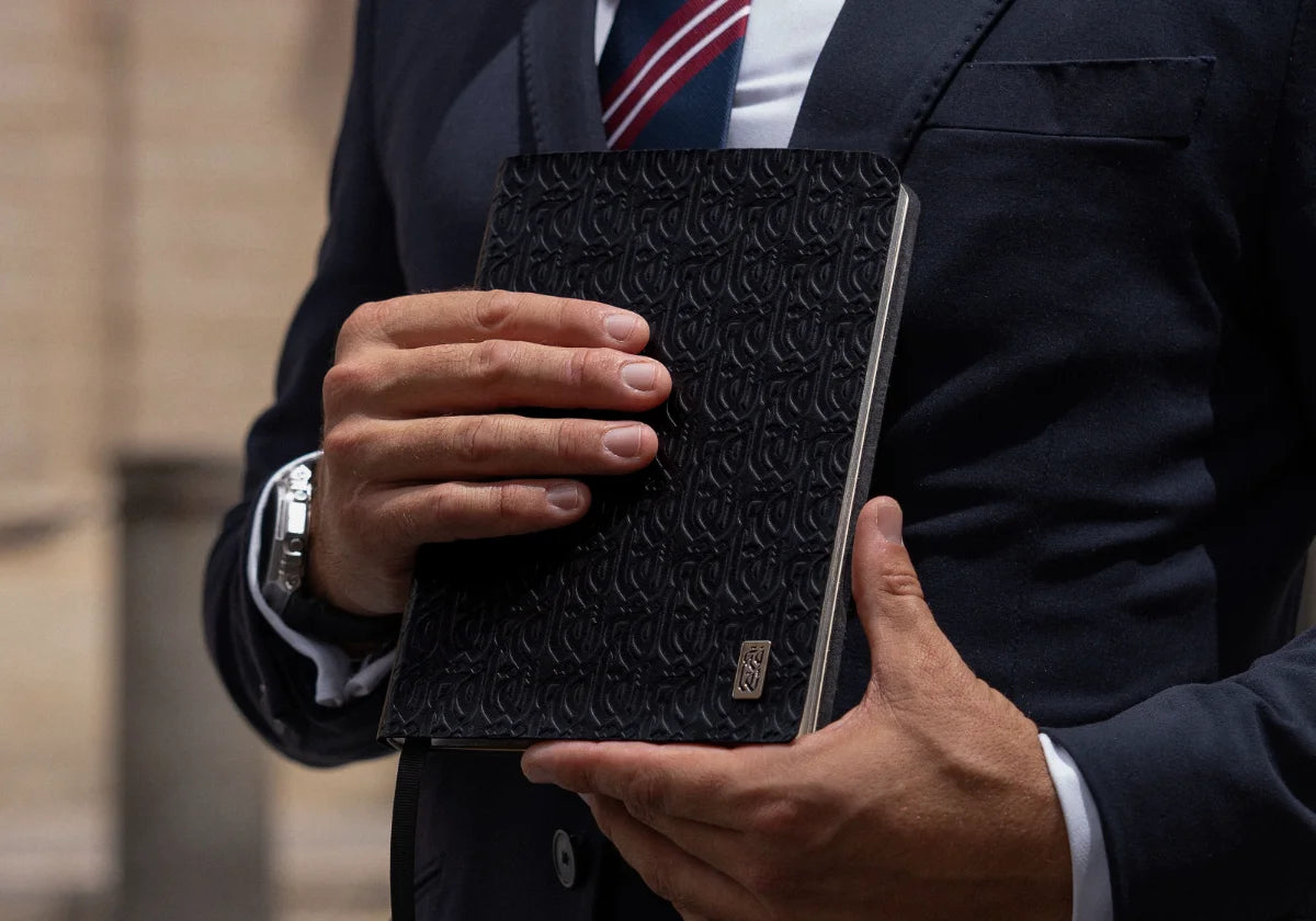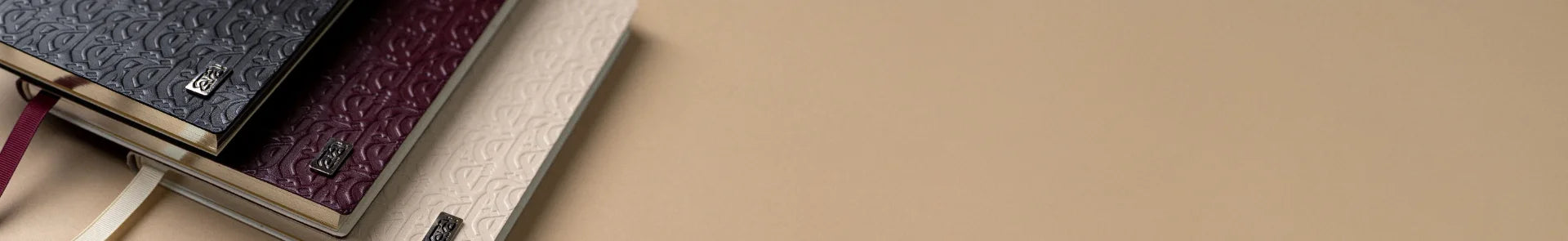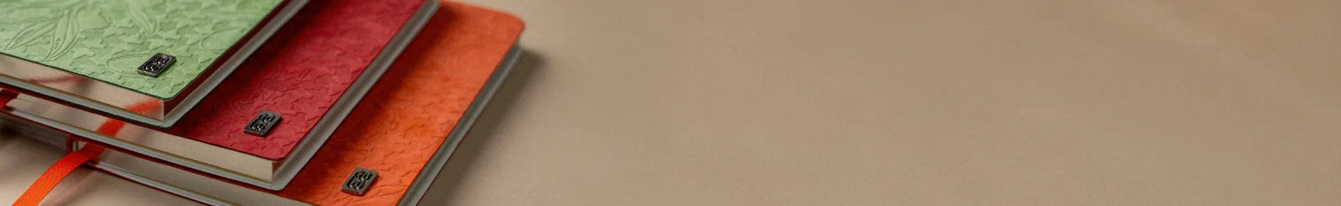Vegetable-tanned leather. 120gsm ivory paper. Gold foil embossing.